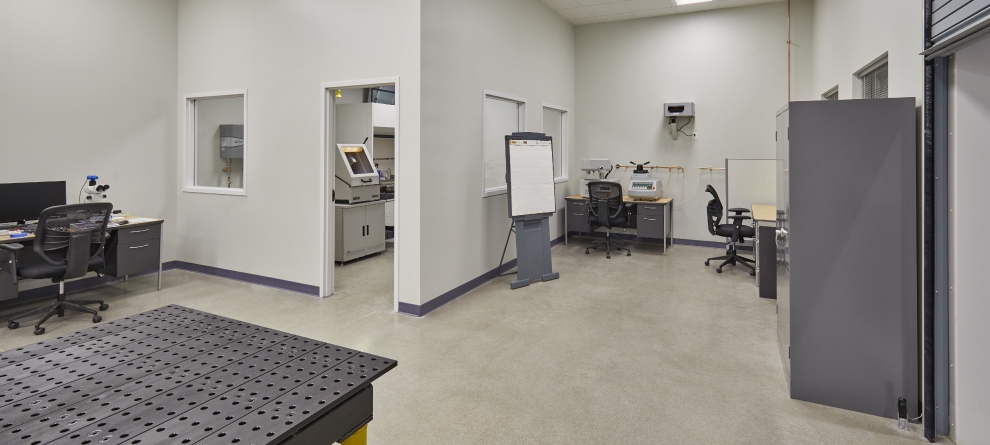 Borrowed light views from interior work areas to production space emphasize safety and management. An open concept layout offers a synergetic work environment providing remote break-out collaboration spaces emphasizing current technologies while providing complete privacy.