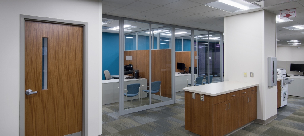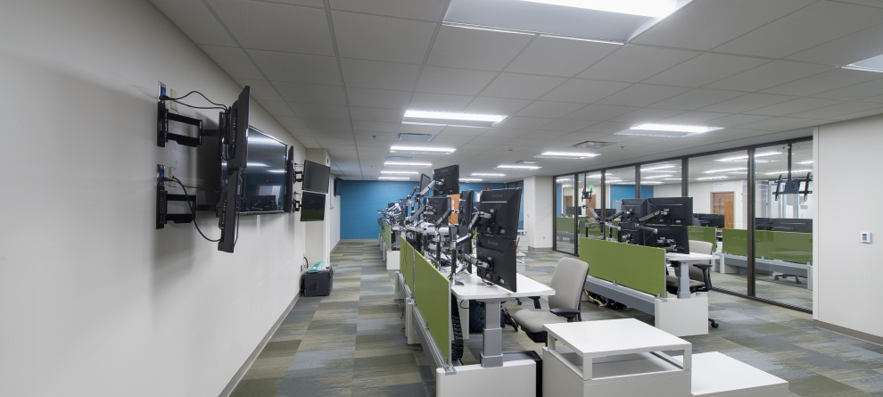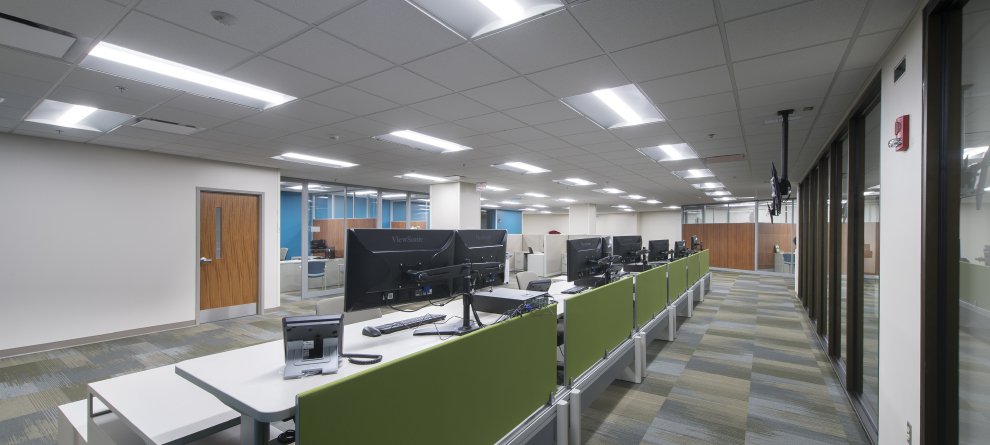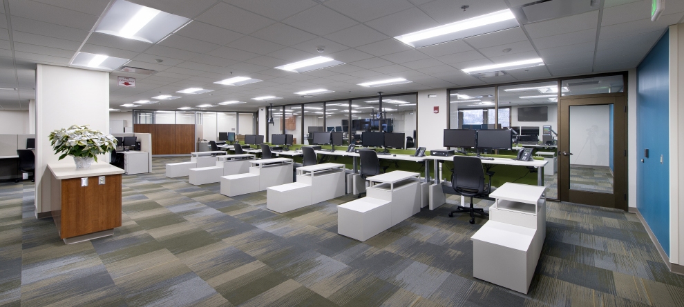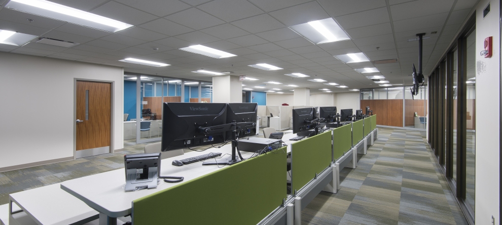 This project’s goal was to consolidate several emergency control services into one space on the ground floor of Parkview Randallia Hospital. They had been previously located in several buildings throughout the city. By bringing them together, they can communicate more efficiently and provide swifter patient care. Some of the services include Dispatch, Security, Bed Management, Behavioral Health, and Voice Services. Although it is on ground floor, natural daylight is still provided through clerestory and storefront window systems. To minimize noise but maximize visual acuity, a glass separation wall was placed between Dispatch and the remaining areas. White noise machines were also strategically located throughout the space. The open area concept was accentuated by new sit-to-stand furniture for maximum staff comfort. Surrounding the main workspace is a new conference room, updated restrooms, IT room, break room and storage.