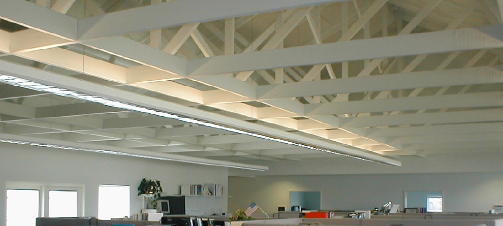 A large new studio for CAD production staff at open office workstation cubicles enjoys natural daylight and views to the courtyard and to the street. The studio is given a sense of spaciousness and volume by the use of high ceilings with open, exposed wood trusses and linear, direct/indirect light fixtures. A new basement underneath the studio provides much needed record and archival filing and storage space.