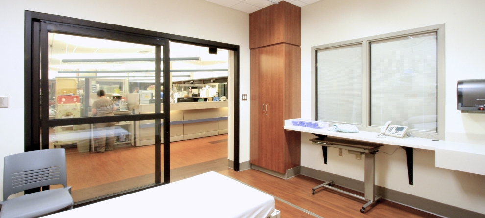 Within the existing Emergency Department at Randallia hospital, there was a need to enclose an area for behavioral health services. This provided the greatest degree of security and safety for the staff and patients entering the department. Three existing holding spaces were updated to comply with today’s standards of care with anti-ligature measures. Due to the occasional extended stay in some of these rooms, recessed and enclosed televisions were provided to create a calming environment.