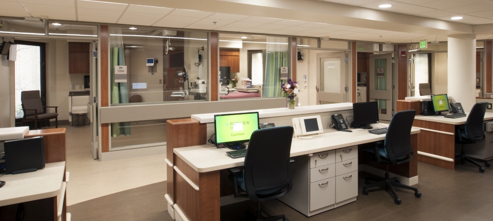 As one of the first projects of the $55 million dollar budget, this renovation brought ICU services back to the Randallia campus to eliminate the number of transfers to surrounding hospitals. The area had been used as an ICU in the past, but needed to be brought up to today’s standards through updated aesthetics and technology. This unit provides 12 ICU rooms, two of which could be used for isolation. The old patient care modules and gas columns were removed. A new decorative headwall was installed with in-wall gas outlets along with a new updated patient care module. Each of the rooms is equipped with new patient bed lifts along with state of the art EICU monitoring that allows each patient to communicate with a doctor remotely. Anti-microbial countertops and door hardware were installed as an effort to reduce the spread of germs throughout the unit.