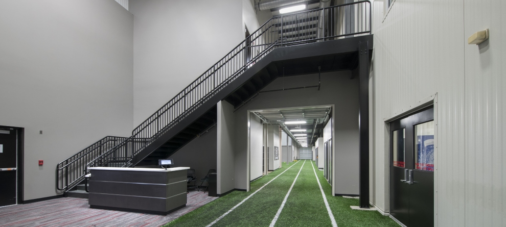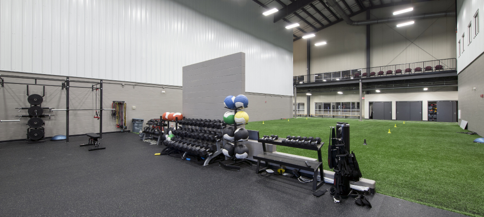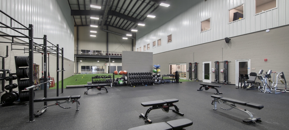 Athletes with Purpose (AWP) located on the first floor provides a state of the art weights and agility areas separate from the open gym with a sport turf sprint track. AWP also offers performance training classes for adults. The weights area sports a 10mm MONDO rubber flooring system to withstand heavy use. AWP has its own dedicated entrance and reception area/ lobby.